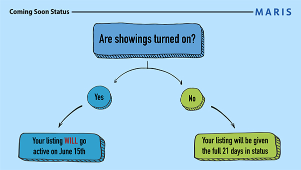 What does this mean for listings that will be within the 21-day window of Coming Soon status? All listings entered into the MLS in Coming Soon status with showings turned ON will automatically convert to Active status on June 15th. Coming Soon listings entered into the MLS with showings turned OFF will be able to complete their 21 days in the Coming Soon status. The flow chart below offers a more visual representation of your Coming Soon listing’s active date.