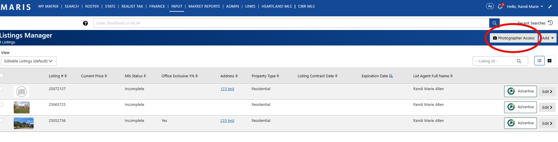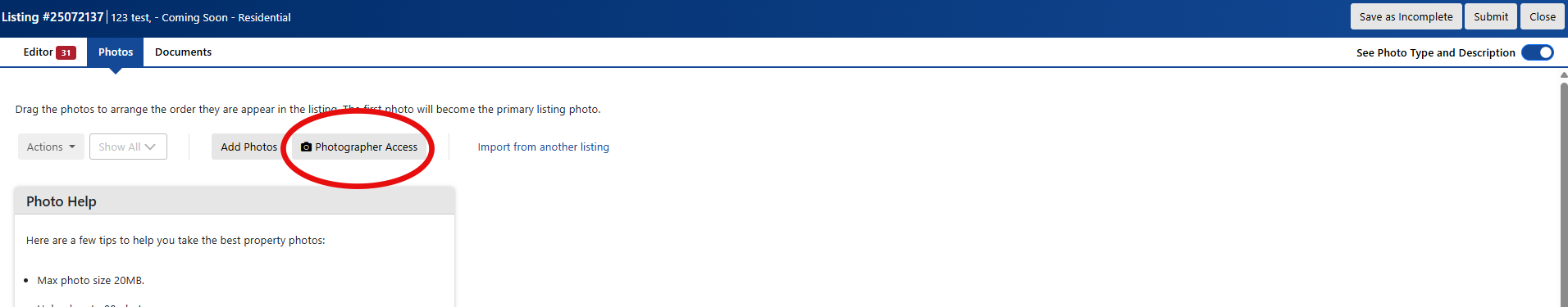 1. Invite your photographer via email to upload photos to your listings. Just click the “Photographer Access” button on your listing: